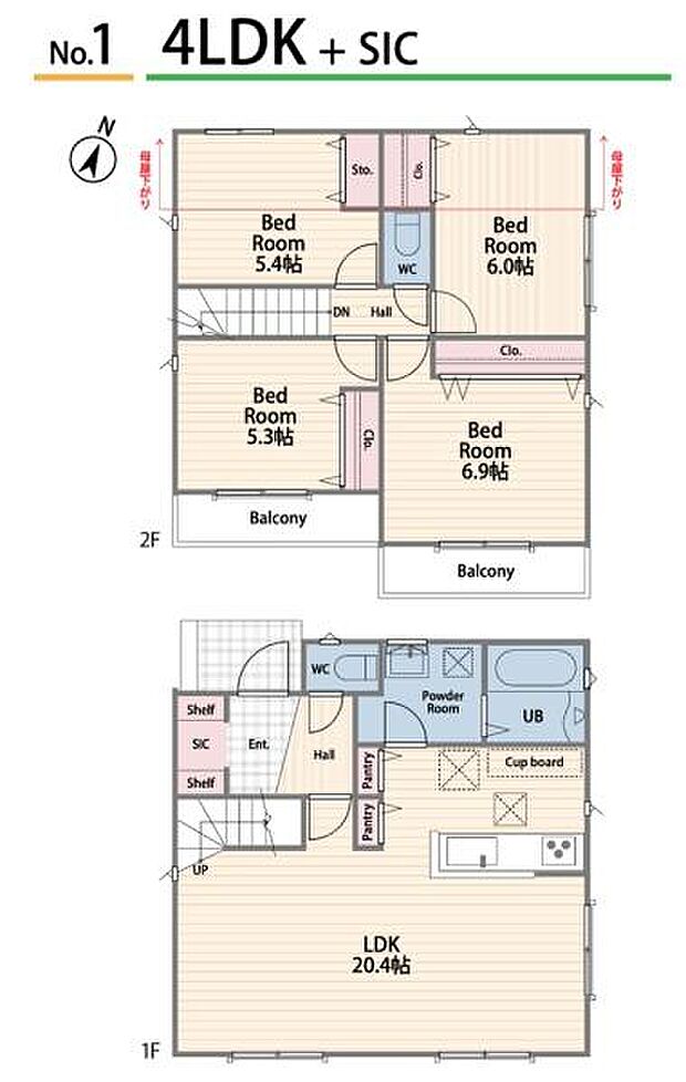 | 間取り | 4LDK 間取り内訳:リビングダイニングキッチン 20.4帖(1階)・洋室 6.9帖(2階)・洋室 6帖(2階)・洋室 5.4帖(2階)・洋室 5.3帖(2階) |