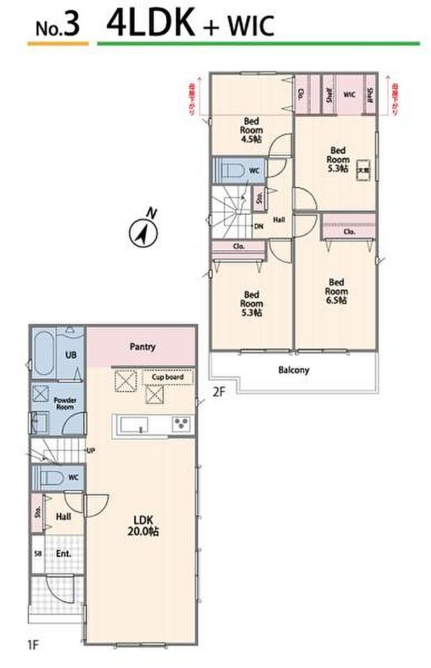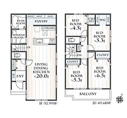 | 間取り | 4LDK 間取り内訳:リビングダイニングキッチン 20帖(1階)・洋室 6.5帖(2階)・洋室 5.3帖(2階)・洋室 5.3帖(2階)・洋室 4.5帖(2階) |
