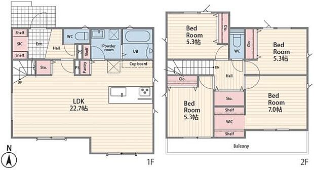 間取り内訳:リビングダイニングキッチン 22.7帖(1階)・洋室 7帖(2階)・洋室 5.3帖(2階)・洋室 5.3帖(2階)・洋室 5.3帖(2階)