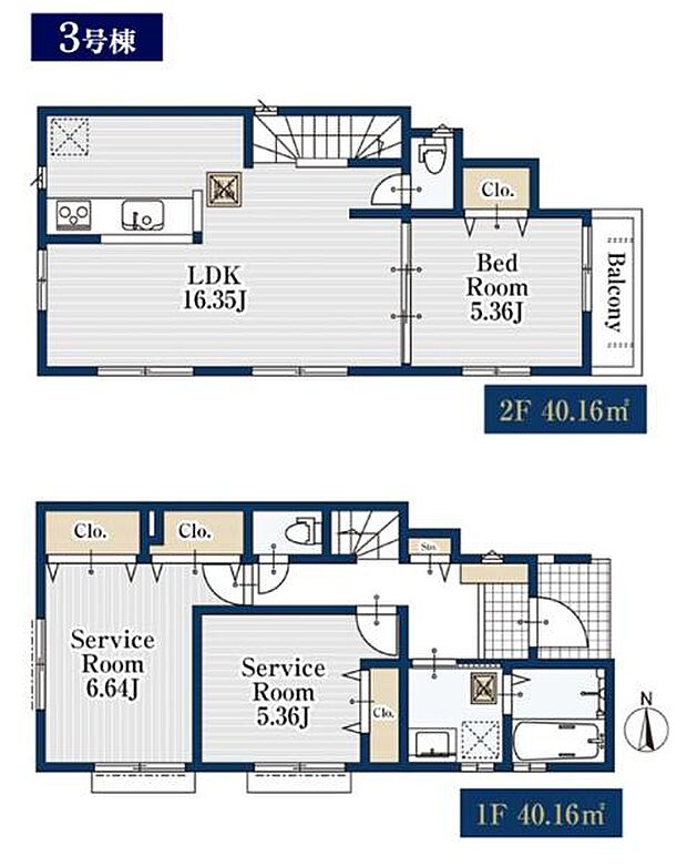 間取り内訳:収納 6.6帖(1階)・収納 5.3帖(1階)・リビングダイニングキッチン 16.3帖(2階)・洋室 5.3帖(2階)