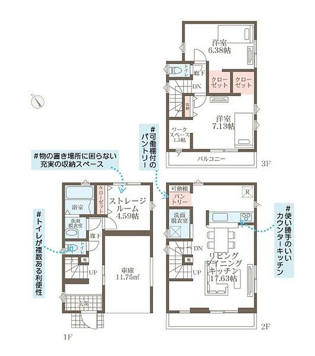 | 間取り | 2SLDK 間取り内訳:収納 4.5帖(1階)・リビングダイニングキッチン 17.6帖(2階)・洋室 6.3帖(3階)・洋室 7.1帖(3階) |