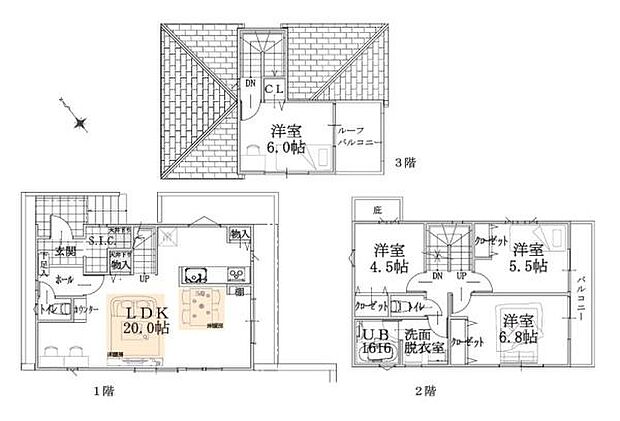 | 間取り | 4LDK 間取り内訳:リビングダイニングキッチン 20帖(1階)・洋室 4.5帖(2階)・洋室 5.5帖(2階)・洋室 6.8帖(2階)・洋室 6帖(3階) |