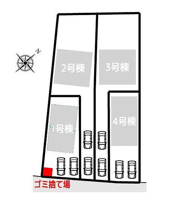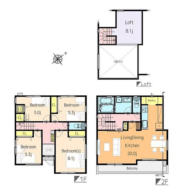 | 間取り | 4LDK 間取り内訳:洋室 5.3帖(1階)・洋室 8.1帖(1階)・洋室 5.3帖(1階)・洋室 5帖(1階)・リビングダイニングキッチン 20帖(2階) |