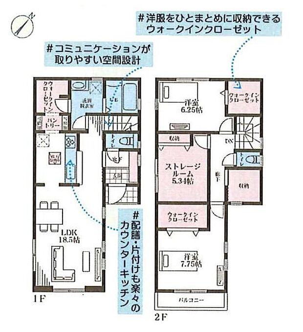 | 間取り | 2SLDK 間取り内訳:リビングダイニングキッチン 18.5帖(1階)・洋室 6.2帖(2階)・収納 5.3帖(2階)・洋室 7.7帖(2階) |