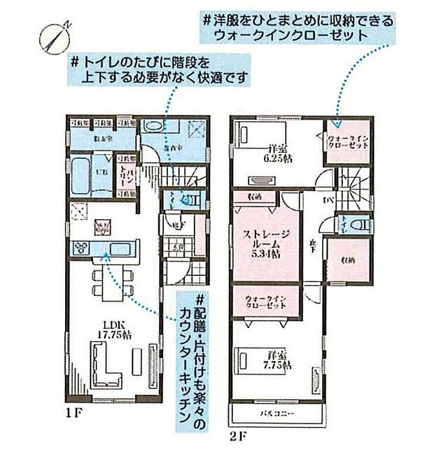 | 間取り | 2SLDK 間取り内訳:リビングダイニングキッチン 17.7帖(1階)・洋室 6.2帖(2階)・収納 5.3帖(2階)・洋室 7.7帖(2階) |