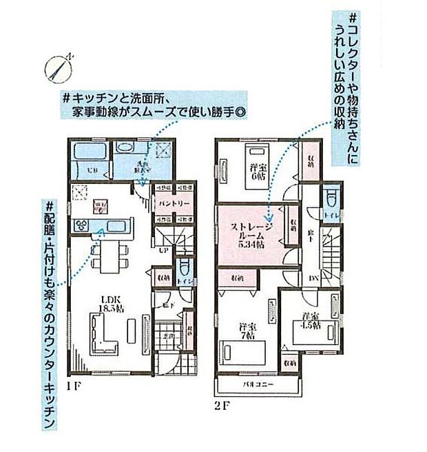 | 間取り | 3SLDK 間取り内訳:リビングダイニングキッチン 18.5帖(1階)・洋室 6帖(2階)・収納 5.3帖(2階)・洋室 7帖(2階)・洋室 4.5帖(2階) |