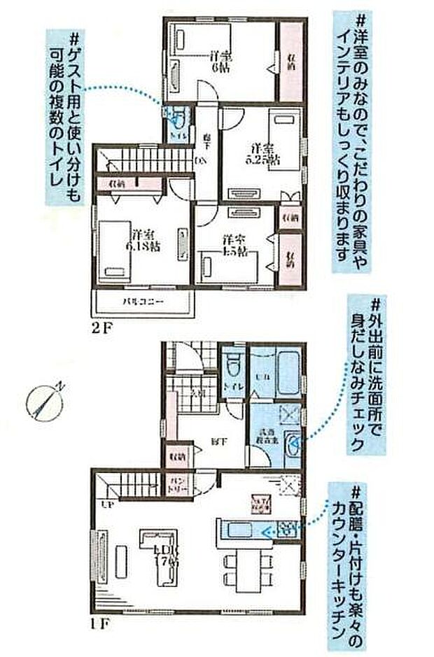 | 間取り | 4LDK 間取り内訳:リビングダイニングキッチン 17帖(1階)・洋室 6.1帖(2階)・洋室 4.5帖(2階)・洋室 5.2帖(2階)・洋室 6帖(2階) |