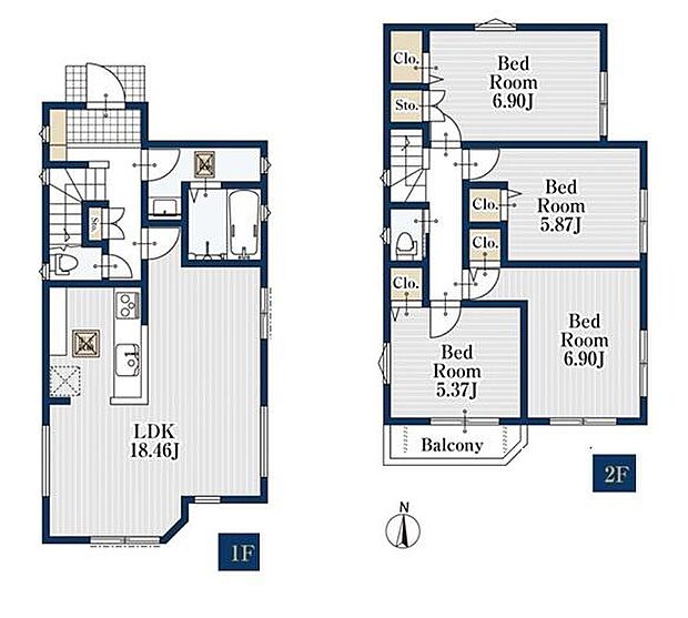 | 間取り | 4LDK 間取り内訳:リビングダイニングキッチン 18.4帖(1階)・洋室 6.9帖(2階)・洋室 5.8帖(2階)・洋室 6.9帖(2階)・洋室 5.3帖(2階) |