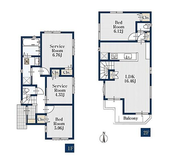| 間取り | 2SLDK 間取り内訳:収納 6.7帖(1階)・収納 4.3帖(1階)・洋室 5帖(1階)・洋室 6.1帖(2階)・リビングダイニングキッチン 16.4帖(2階) |