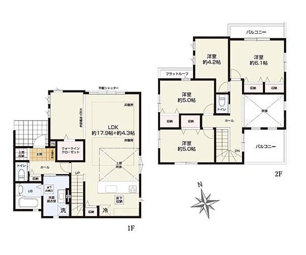 | 間取り | 4LDK 間取り内訳:リビングダイニングキッチン 22.2帖(1階)・洋室 6.1帖(2階)・洋室 4.2帖(2階)・洋室 5帖(2階)・洋室 5帖(2階) |
