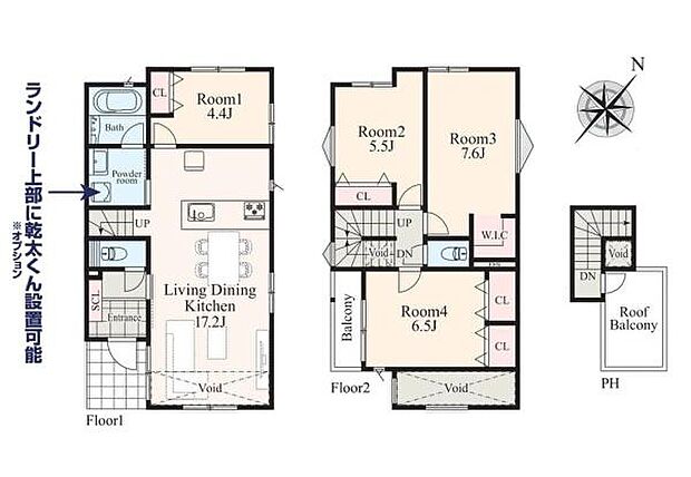 | 間取り | 4LDK 間取り内訳:リビングダイニングキッチン 17.2帖(1階)・洋室 4.4帖(1階)・洋室 6.5帖(2階)・洋室 7.6帖(2階)・洋室 5.5帖(2階) |
