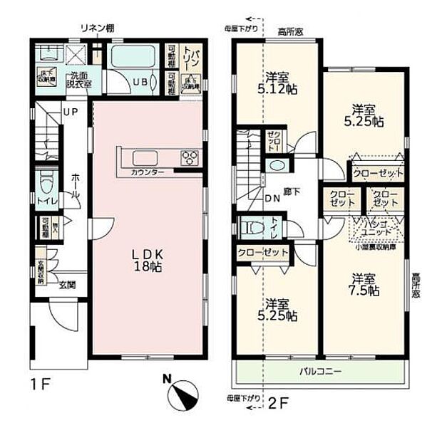 間取り内訳:洋室 5.2帖(2階)・洋室 5.1帖(2階)・リビングダイニングキッチン 18帖(1階)・洋室 5.2帖(2階)・洋室 7.5帖(2階)