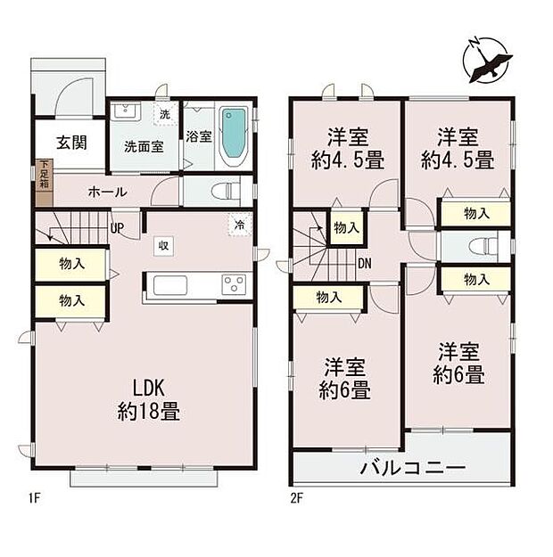 | 間取り | 4LDK 間取り内訳:リビングダイニングキッチン 18帖(1階)・洋室 6帖(2階)・洋室 6帖(2階)・洋室 4.5帖(2階)・洋室 4.5帖(2階) |