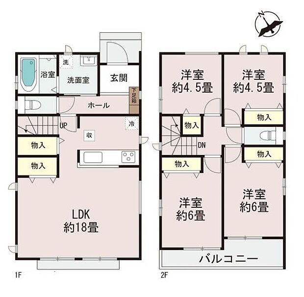 | 間取り | 4LDK 間取り内訳:リビングダイニングキッチン 18帖(1階)・洋室 6帖(2階)・洋室 6帖(2階)・洋室 4.5帖(2階)・洋室 4.5帖(2階) |