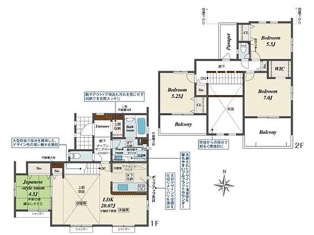 間取り内訳:洋室 5.2帖(2階)・洋室 7帖(2階)・洋室 5.5帖(2階)・リビングダイニングキッチン 20帖(1階)・和室 4.5畳(1階)