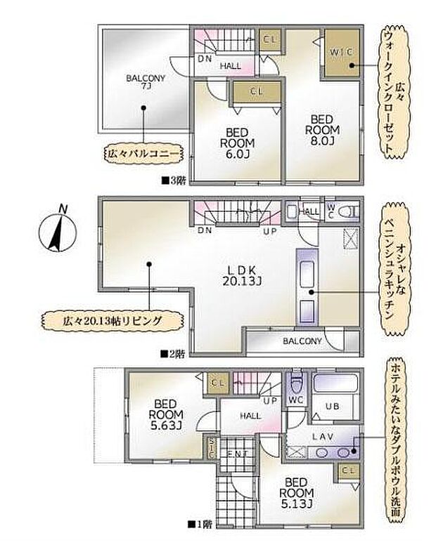 | 間取り | 4LDK 間取り内訳:洋室 5.6帖(1階)・洋室 5.1帖(1階)・リビングダイニングキッチン 20.1帖(2階)・洋室 6帖(3階)・洋室 8帖(3階) |