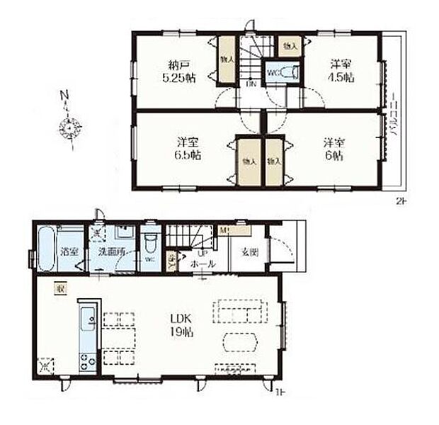 | 間取り | 3SLDK 間取り内訳:リビングダイニングキッチン 19帖(1階)・洋室 4.5帖(2階)・洋室 6帖(2階)・洋室 6.5帖(2階)・収納 5.2帖(2階) |