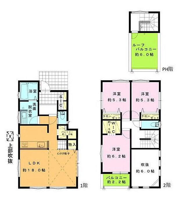 | 間取り | 3LDK 間取り内訳:リビングダイニングキッチン 18帖(1階)・洋室 5.3帖(2階)・洋室 5.3帖(2階)・洋室 6.2帖(2階) |