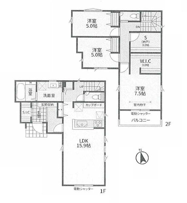 間取り内訳:リビングダイニングキッチン 15.9帖(1階)・洋室 5帖(2階)・洋室 5帖(2階)・洋室 7.5帖(2階)