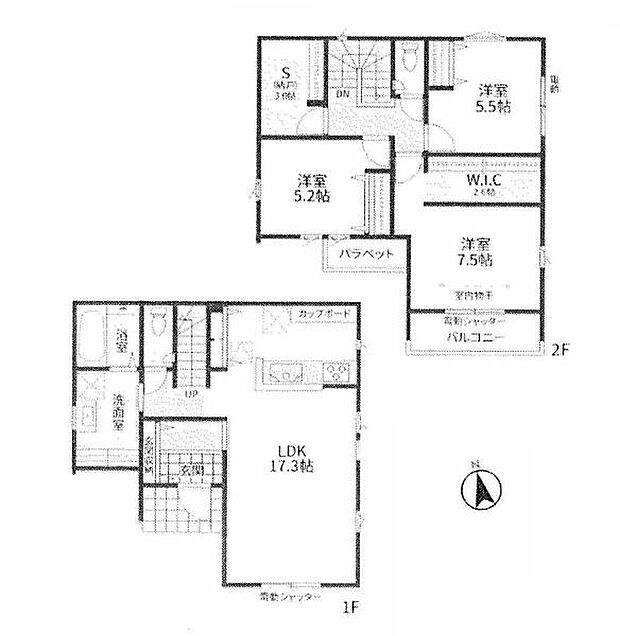 | 間取り | 3LDK 間取り内訳:リビングダイニングキッチン 17.3帖(1階)・洋室 5.2帖(2階)・洋室 7.5帖(2階)・洋室 5.5帖(2階) |