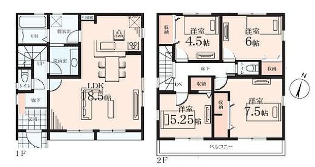 | 間取り | 4LDK 間取り内訳:リビングダイニングキッチン 18.5帖(1階)・洋室 5.2帖(2階)・洋室 7.5帖(2階)・洋室 6帖(2階)・洋室 4.5帖(2階) |