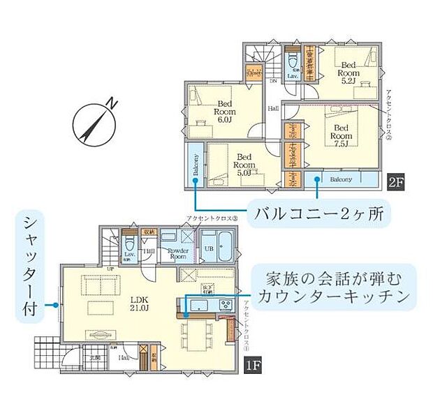 | 間取り | 4LDK 間取り内訳:リビングダイニングキッチン 21帖(1階)・洋室 6帖(2階)・洋室 5帖(2階)・洋室 7.5帖(2階)・洋室 5.2帖(2階) |