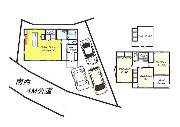 | 間取り | 3LDK 間取り内訳:リビングダイニングキッチン 18帖(1階)・洋室 7.5帖(2階)・洋室 6帖(2階)・洋室 7.2帖(2階) |