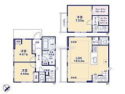 | 間取り | 3LDK 間取り内訳:洋室 4.6帖(1階)・洋室 4.6帖(1階)・リビングダイニングキッチン 18帖(2階)・洋室 7.5帖(3階) |