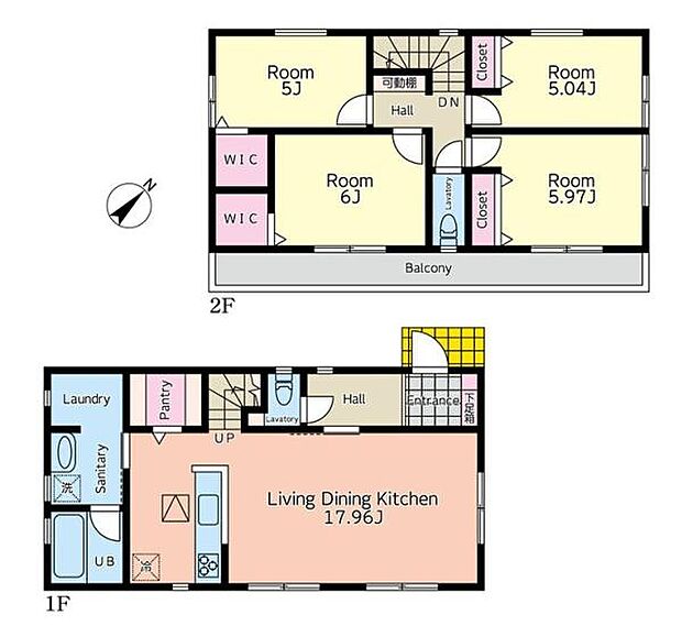 間取り内訳:リビングダイニングキッチン 17.9帖(1階)・洋室 5帖(2階)・洋室 6帖(2階)・洋室 5.9帖(2階)・洋室 5帖(2階)
