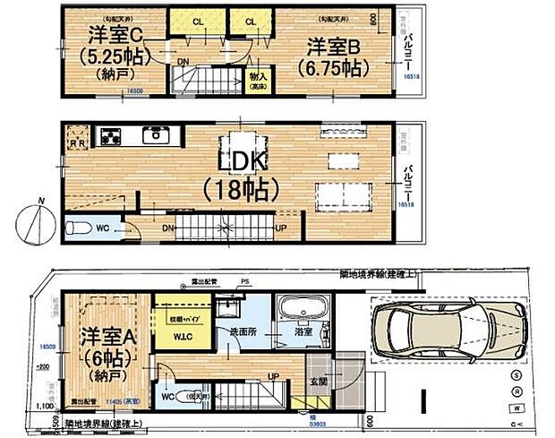 | 間取り | 3LDK 間取り内訳:洋室 6帖(1階)・リビングダイニングキッチン 18帖(2階)・洋室 5.2帖(3階)・洋室 6.7帖(3階) |