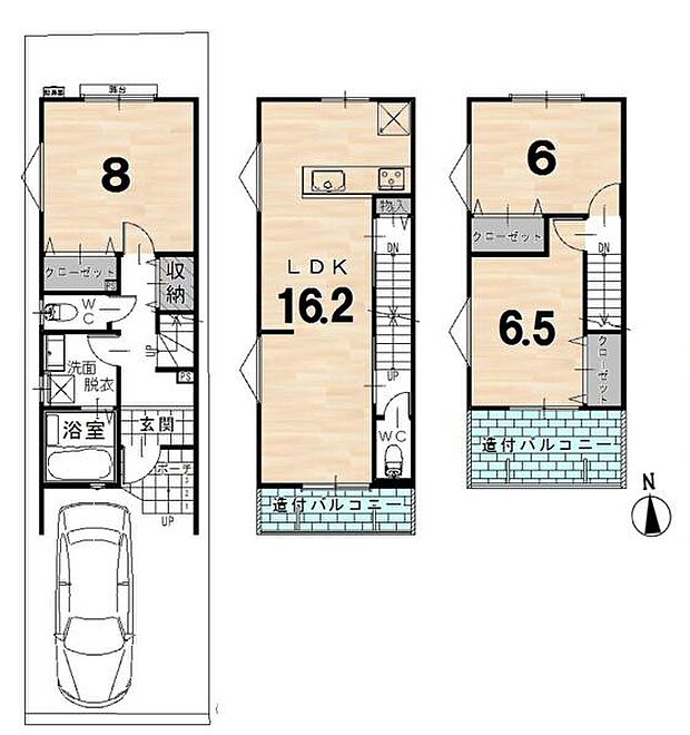 | 間取り | 3LDK 間取り内訳:洋室 8帖(1階)・リビングダイニングキッチン 16.2帖(2階)・洋室 6帖(3階)・洋室 6.5帖(3階) |