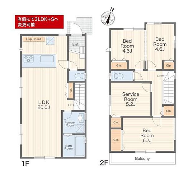 | 間取り | 2SLDK 間取り内訳:洋室 6.7帖(2階)・リビングダイニングキッチン 20帖(1階)・洋室 9.2帖(2階)・収納 5.2帖(2階) |