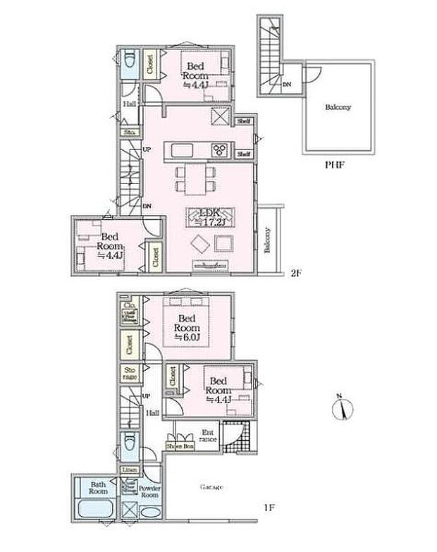 | 間取り | 4LDK 間取り内訳:洋室 6帖(1階)・洋室 4.4帖(1階)・洋室 4.4帖(2階)・洋室 4.4帖(2階)・リビングダイニングキッチン 17.2帖(2階) |