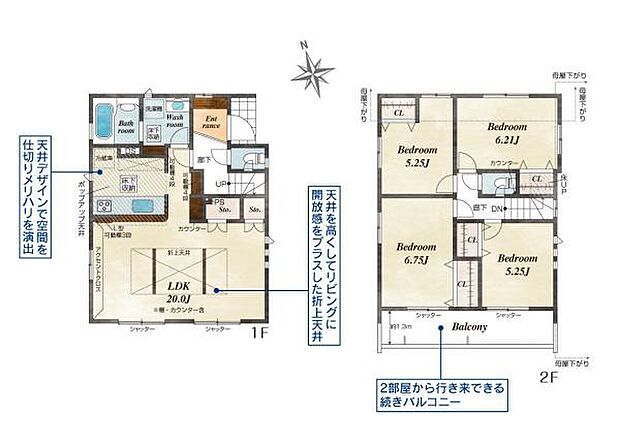 | 間取り | 4LDK 間取り内訳:リビングダイニングキッチン 20帖(1階)・洋室 5.2帖(2階)・洋室 6.7帖(2階)・洋室 5.2帖(2階)・洋室 6.2帖(2階) |