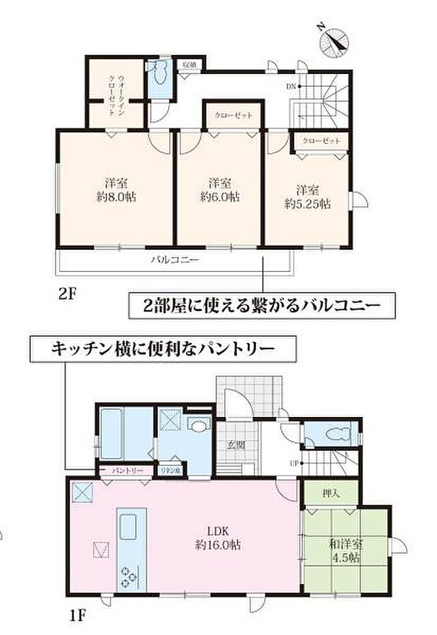 | 間取り | 4LDK 間取り内訳:リビングダイニングキッチン 16帖(1階)・和室 4.5畳(1階)・洋室 8帖(2階)・洋室 6帖(2階)・洋室 5.2帖(2階) |
