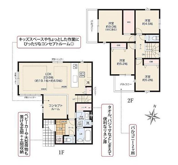 | 間取り | 4LDK 間取り内訳:洋室 5.2帖(2階)・洋室 5.2帖(2階)・洋室 4.5帖(2階)・リビングダイニングキッチン 23.6帖(1階)・洋室 9帖(2階) |