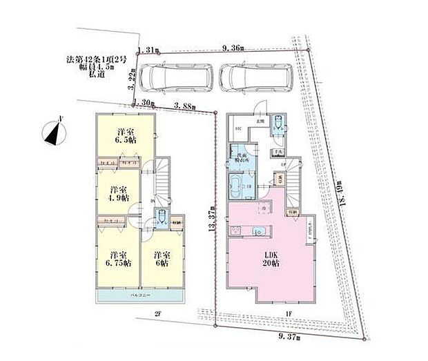 | 間取り | 4LDK 間取り内訳:リビングダイニングキッチン 20帖(1階)・洋室 6.5帖(2階)・洋室 4.9帖(2階)・洋室 6.7帖(2階)・洋室 6帖(2階) |