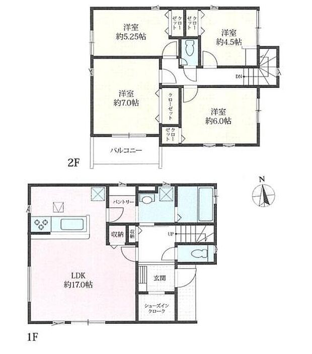 | 間取り | 4LDK 間取り内訳:リビングダイニングキッチン 17帖(1階)・洋室 5.2帖(2階)・洋室 7帖(2階)・洋室 6帖(2階)・洋室 4.5帖(2階) |
