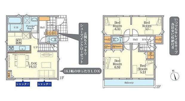 | 間取り | 3LDK 間取り内訳:リビングダイニングキッチン 16.1帖(1階)・洋室 6.9帖(2階)・洋室 5.2帖(2階)・洋室 9.3帖(2階) |