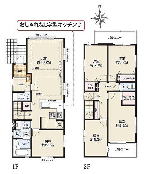 | 間取り | 4SLDK 間取り内訳:リビングダイニングキッチン 18.2帖(1階)・収納 5.2帖(1階)・洋室 5帖(2階)・洋室 5.2帖(2階)・洋室 8.2帖(2階)・洋室 5帖(2階) |