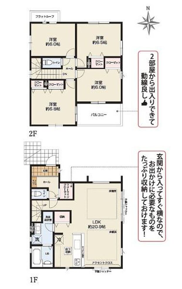 間取り内訳:リビングダイニングキッチン 20.9帖(1階)・洋室 6帖(2階)・洋室 6.8帖(2階)・洋室 6帖(2階)・洋室 6.5帖(2階)