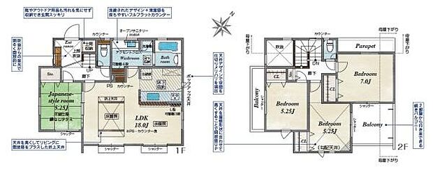 間取り内訳:リビングダイニングキッチン 18帖(1階)・和室 5.2畳(1階)・洋室 5.2帖(2階)・洋室 5.2帖(2階)・洋室 7帖(2階)