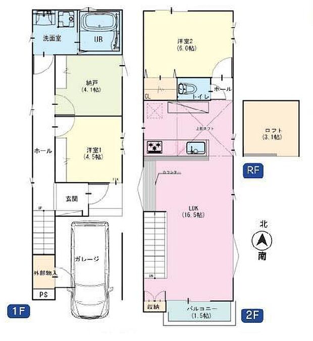 | 間取り | 2SLDK 間取り内訳:収納 4.1帖(1階)・洋室 4.5帖(1階)・洋室 6帖(2階)・リビングダイニングキッチン 16.5帖(2階) |