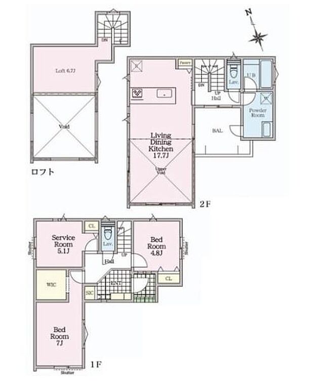 | 間取り | 2SLDK 間取り内訳:収納 5.1帖(1階)・洋室 7帖(1階)・洋室 4.8帖(1階)・リビングダイニングキッチン 17.7帖(2階) |
