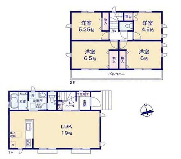 | 間取り | 4LDK 間取り内訳:リビングダイニングキッチン 19帖(1階)・洋室 5.2帖(2階)・洋室 6.5帖(2階)・洋室 6帖(2階)・洋室 4.5帖(2階) |