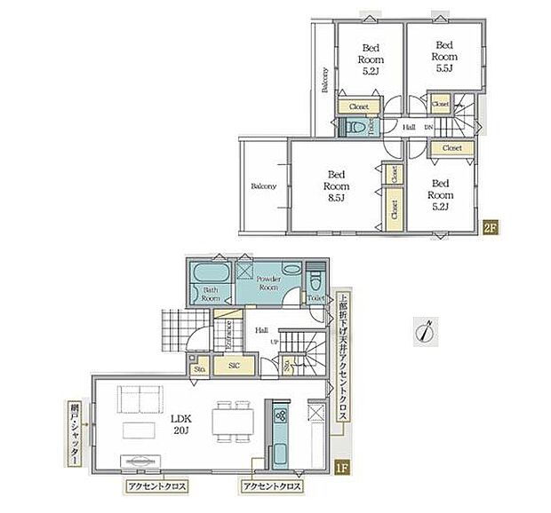 | 間取り | 4LDK 間取り内訳:リビングダイニングキッチン 20帖(1階)・洋室 5.2帖(2階)・洋室 5.5帖(2階)・洋室 5.2帖(2階)・洋室 8.5帖(2階) |