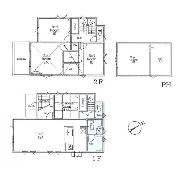 | 間取り | 4LDK 間取り内訳:和室 4.5畳(1階)・洋室 6帖(2階)・洋室 8.5帖(2階)・洋室 6帖(2階)・リビングダイニングキッチン 18帖(1階) |