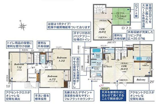 明るさと開放感のある2階リビングプラン。固定階段で楽に上がれるロフトは多目的に利用できます