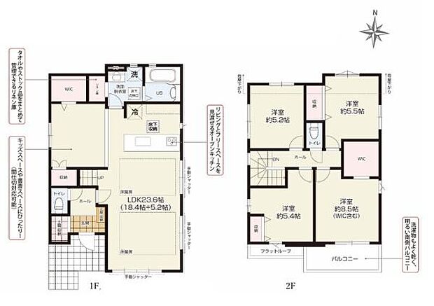 | 間取り | 4LDK 間取り内訳:リビングダイニングキッチン 23.6帖(1階)・洋室 5.2帖(2階)・洋室 5.4帖(2階)・洋室 8.5帖(2階)・洋室 5.5帖(2階) |