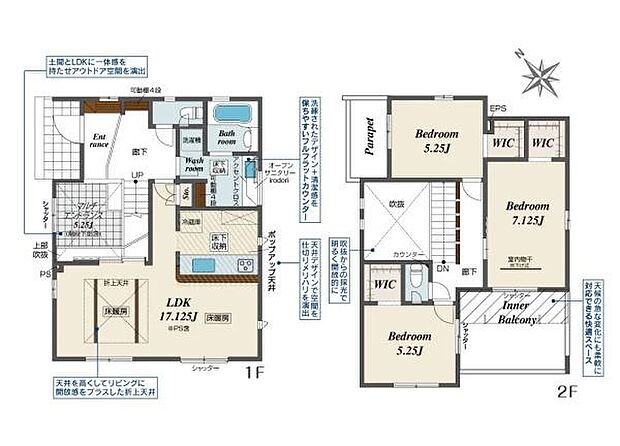 | 間取り | 3LDK 間取り内訳:リビングダイニングキッチン 17.1帖(1階)・洋室 5.2帖(2階)・洋室 7.1帖(2階)・洋室 5.2帖(2階) |
